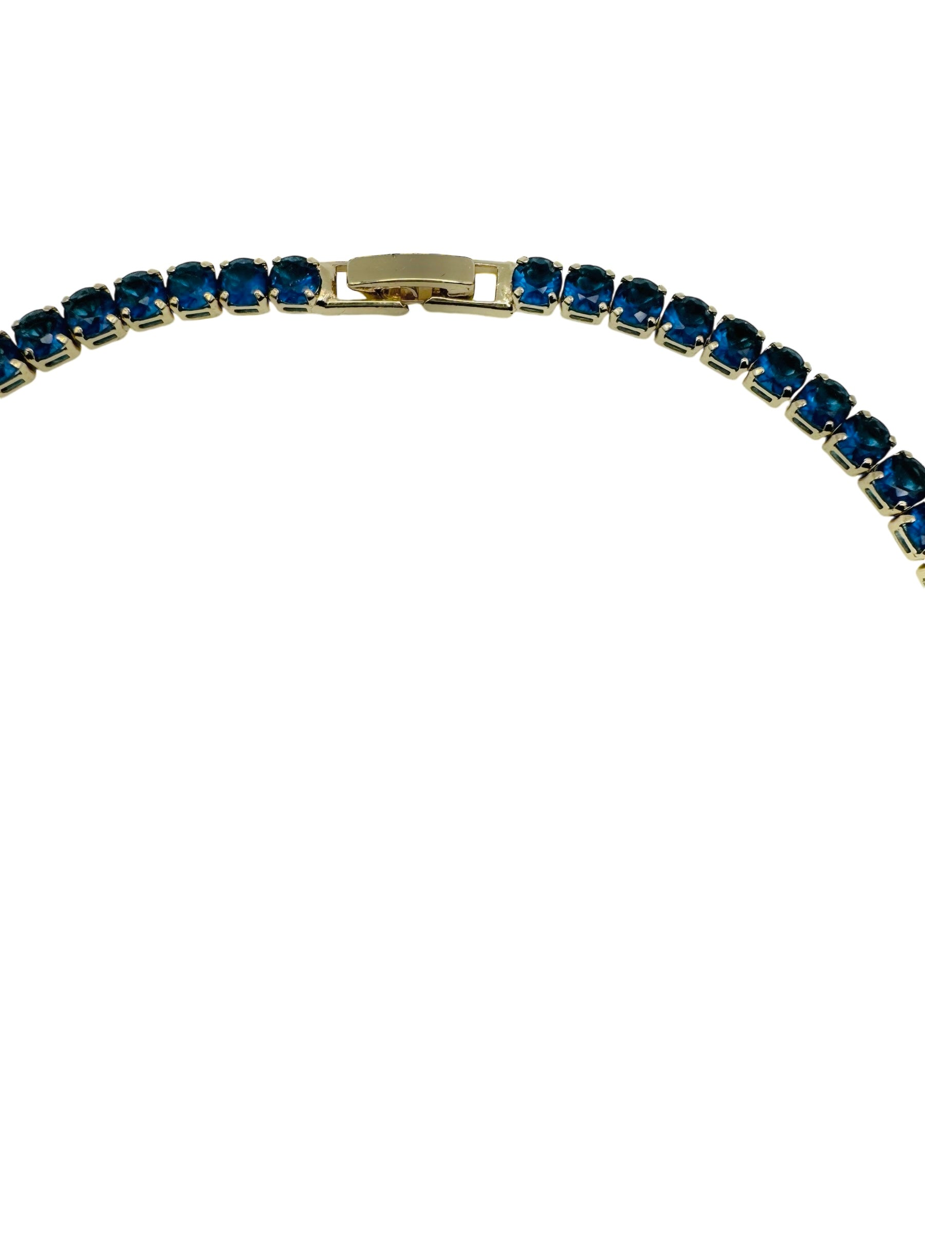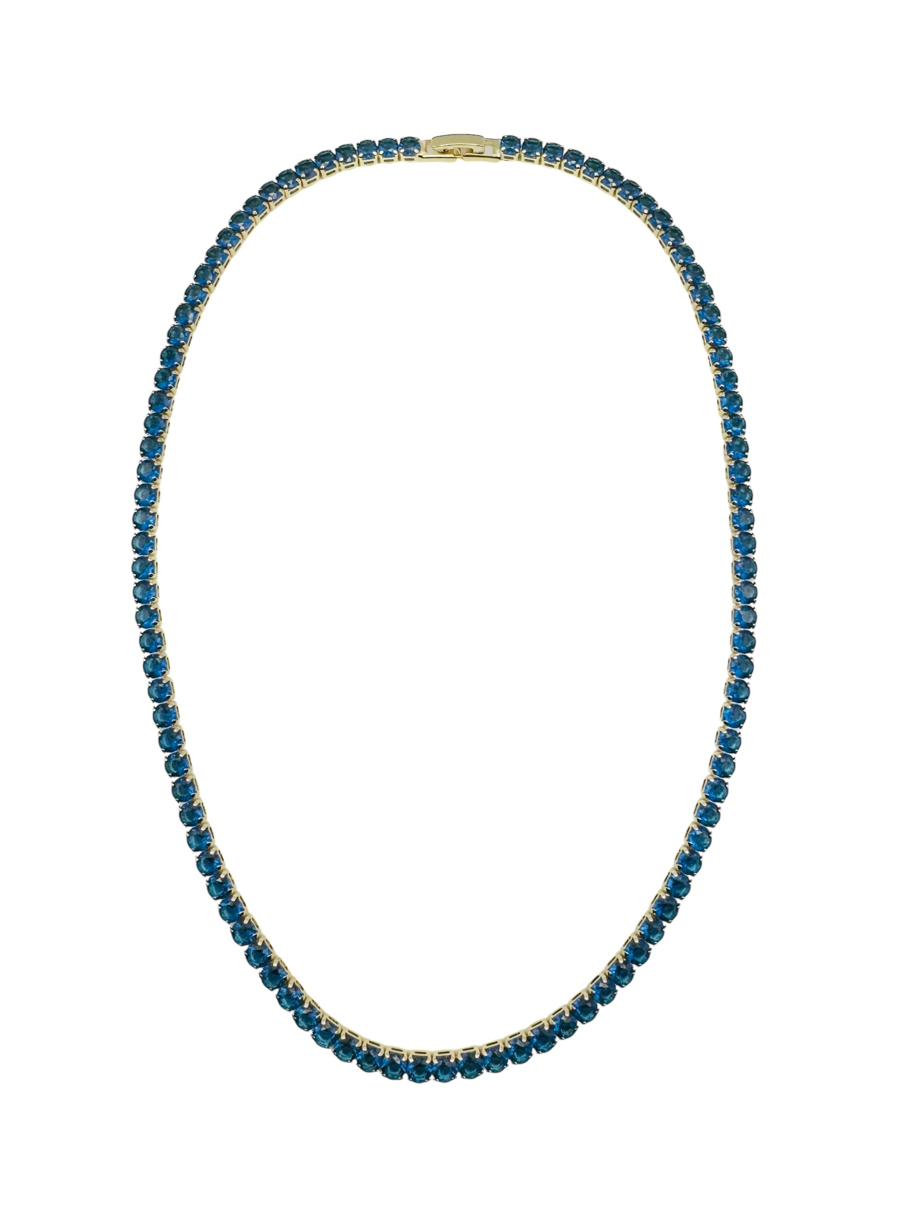 Our Bahama Blue tennis necklace features a striking combination of vibrant blue cubic zirconia, set in a luxurious gold-filled setting that ensures lasting shine and durability.