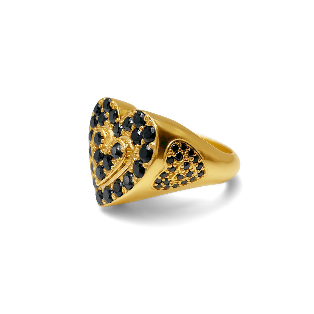 Treat yourself with this artfully crafted gold ring bedazzled in stunning Black Spinal and we’re giving you double the love with the Black Spinel heart motifs on both sides of the ring.
