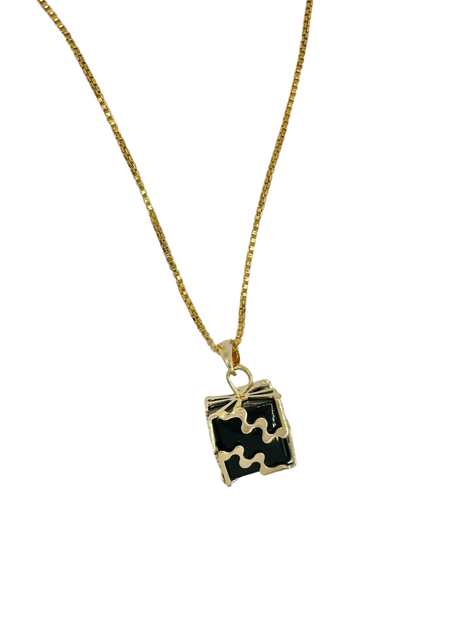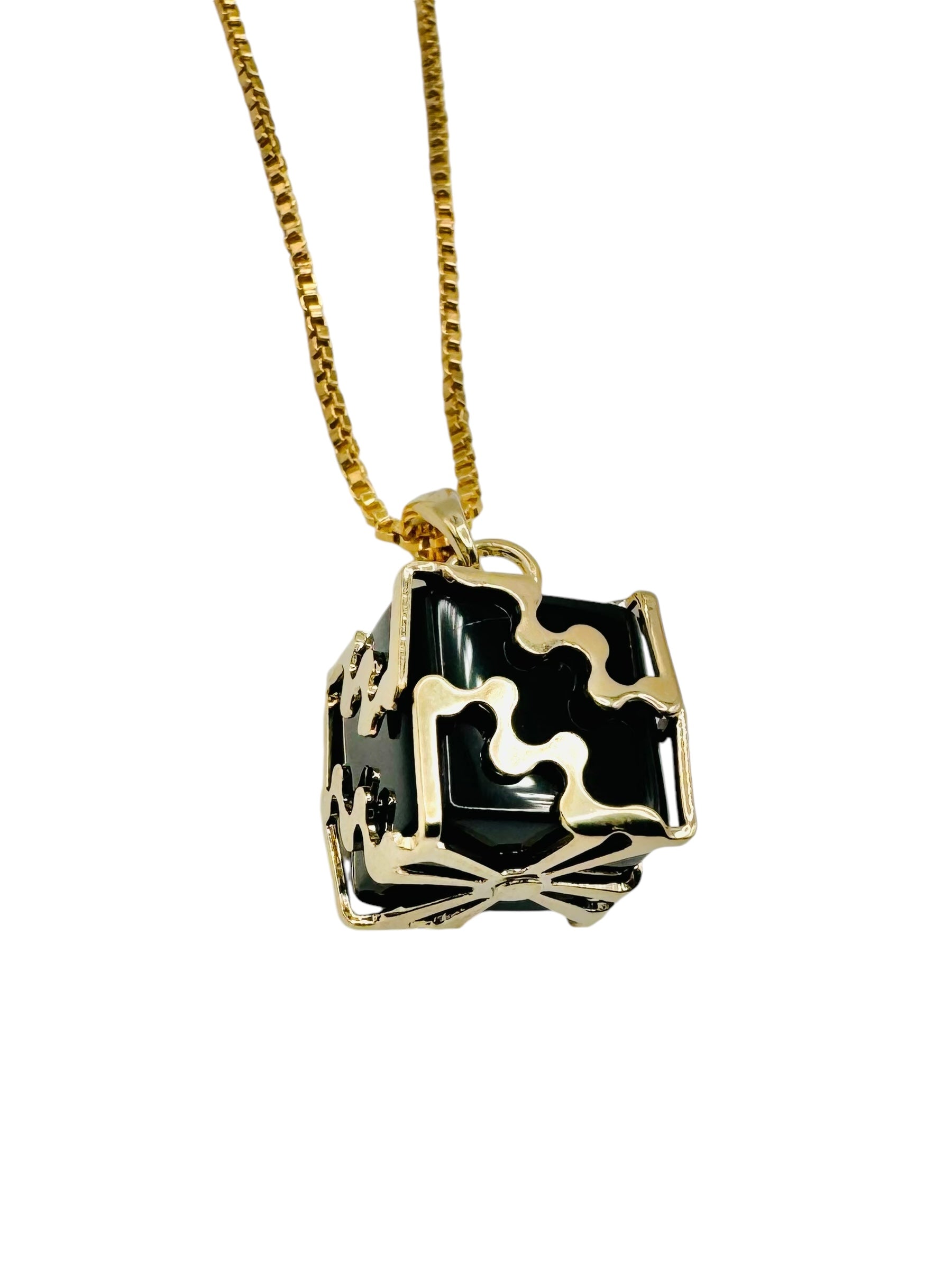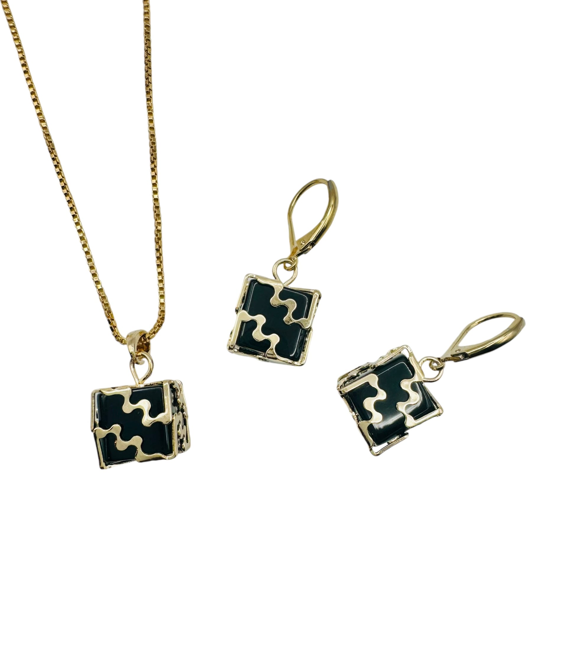Whether worn solo for a minimalist look or layered with other favorites for added impact our Pandora earring and necklace set is versatile enough for everyday elegance and special occasions alike. The standout feature is the unique cube shaped pendant and earrings set accented by freeform gold filled wire, which add a touch of whimsy and romance to a classic pendant and earring design.